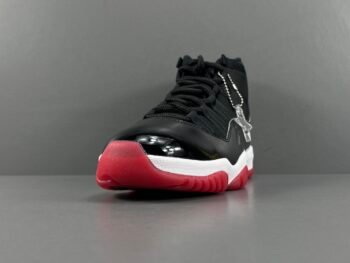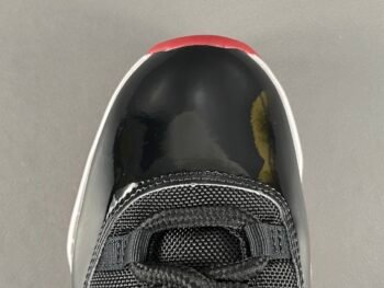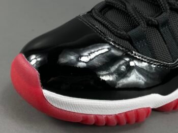 Design iconico: La tomaia delle Jordan 11 è realizzata in pelle verniciata lucida, un elemento distintivo che conferisce alle scarpe un aspetto elegante e sofisticato. Questo dettaglio, introdotto per la prima volta nelle sneakers da basket, non solo migliora l’estetica, ma offre anche maggiore supporto e durata.